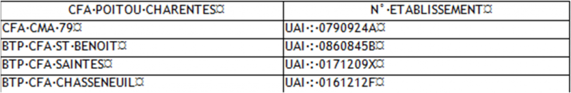 - 26% pour la fraction « quota » dédié au financement des Centres de Formation d’Apprentis (CFA). Vous pouvez affecter cette fraction aux CFA du Poitou-Charentes grâce aux codes après :