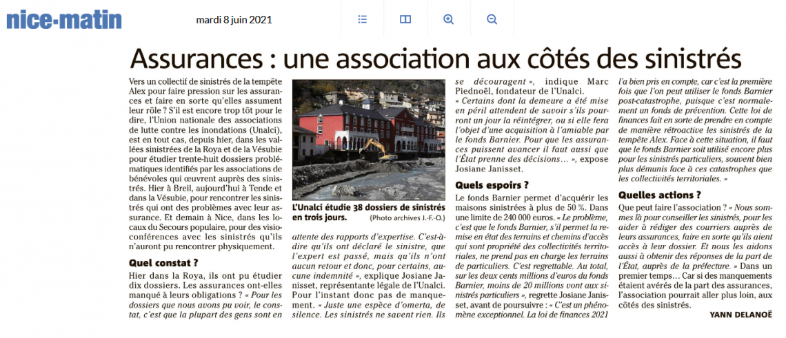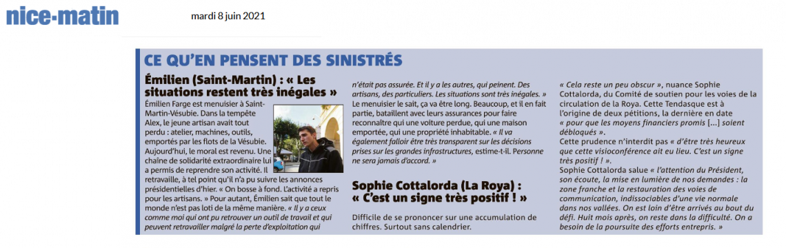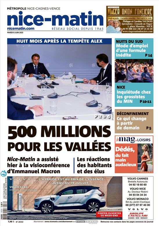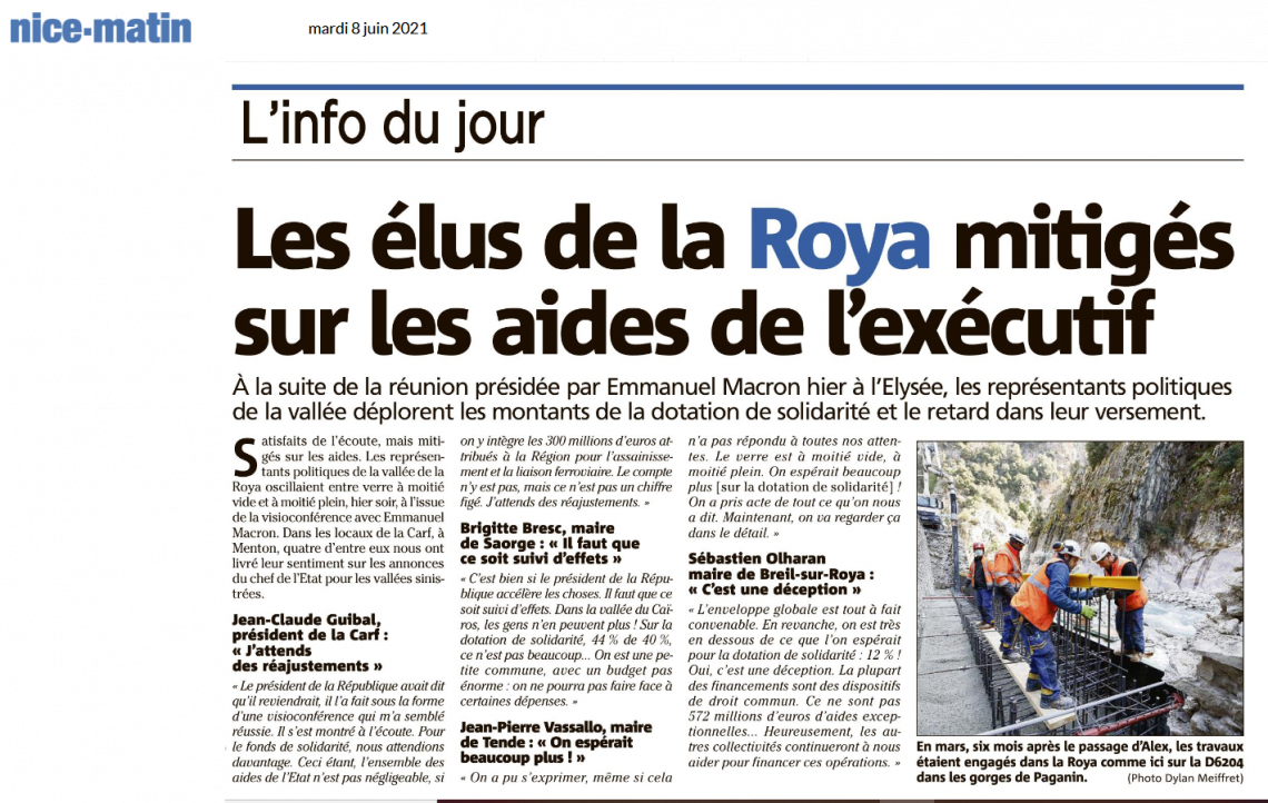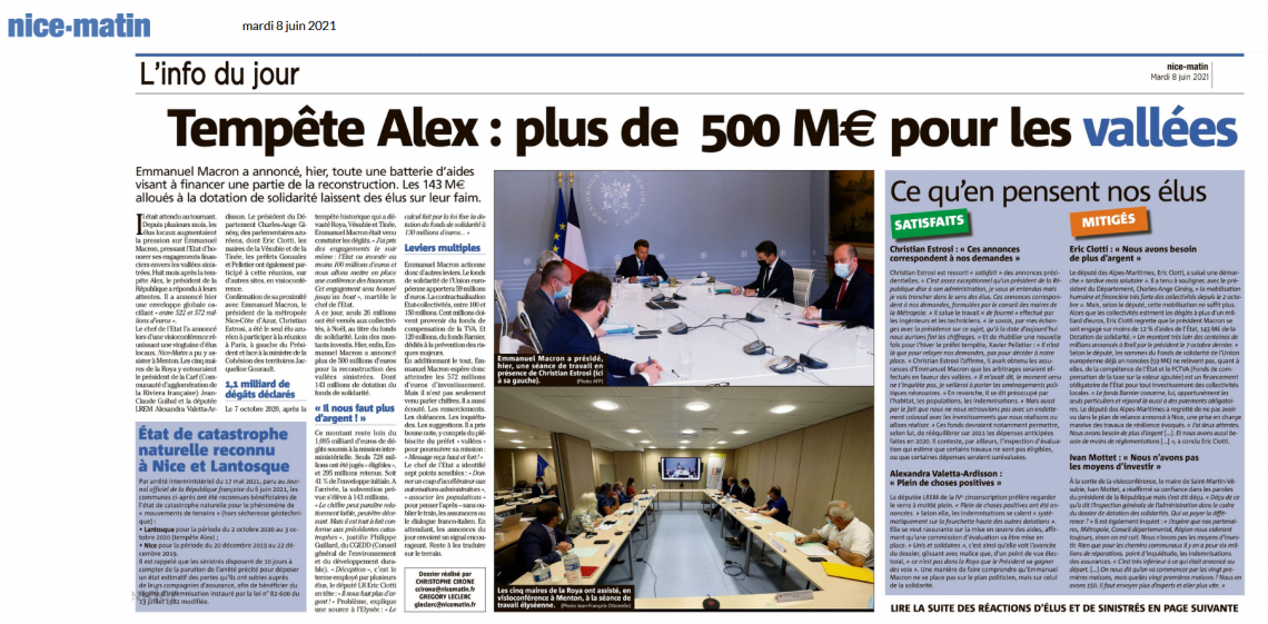 Comme le souligne Nice Matin dans son édition du 8 juin, c'est à l'issue d'une visioconférence très attendue, que le Président Emmanuel Macron a présenté hier l'ensemble des aides qui seront allouées aux vallées sinistrées de notre beau pays niçois.