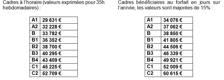 En conséquence, les salaires minima hiérarchiques des Cadres applicables depuis le 1er janvier 2020 demeurent applicables en 2021. Pour rappel, les montants applicables sont les suivants :