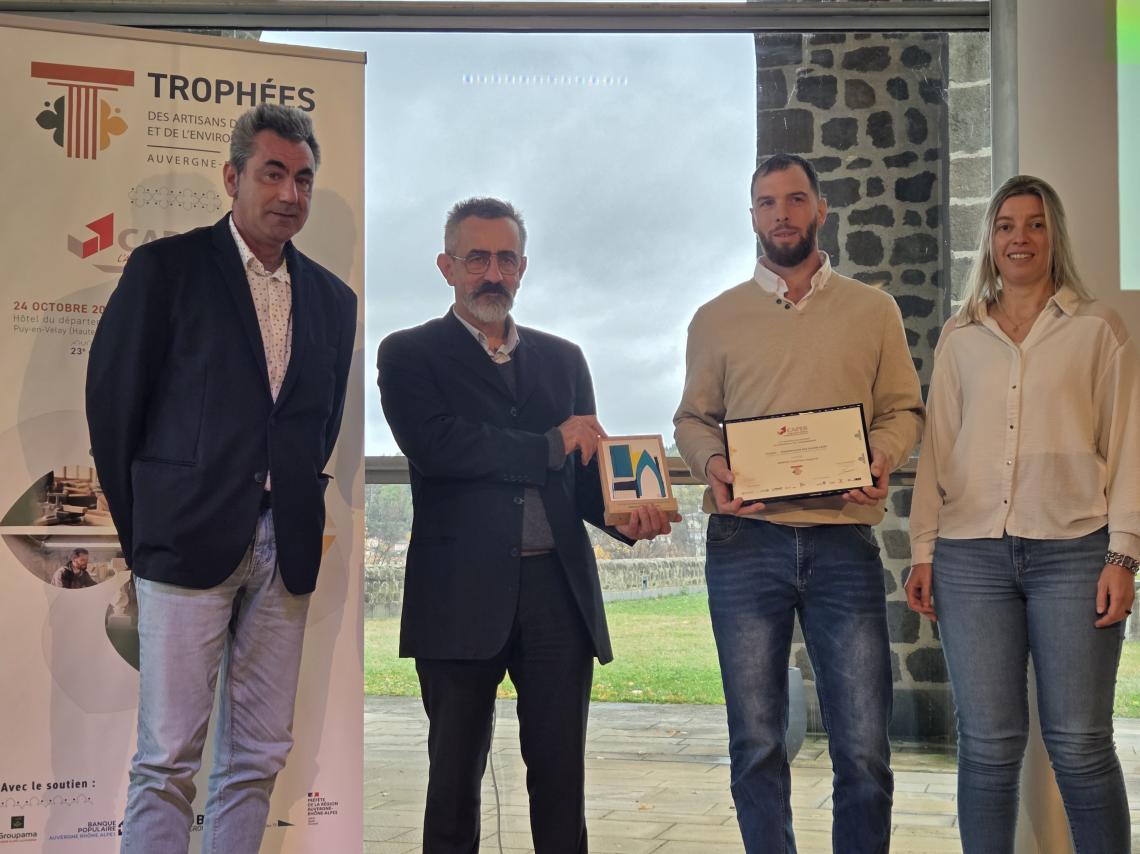 Trophée remis à Clément Avignon par Laurent Marmonier, Président de la CAPEB Auvergne-Rhône-Alpes et Président du jury des Trophées, avec Delphine Durif, Secrétaire générale et Nicolas Bagel, président de la CAPEB Puy-de-Dôme.