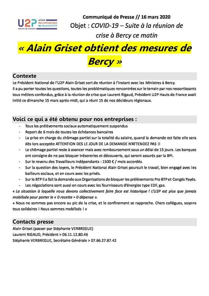 U2P - COVID 19 Alain GRISET obtient des mesures de Bercy