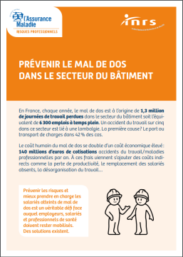 La CNAM présente, dans une brochure spécifique aux employeurs du BTP, les actions techniques, organisationnelles et humaines qu’ils peuvent mettre en place dans leur structure pour réduire ce risque. Le dispositif TMS pro peut également vous aider à maîtriser les risques liés aux TMS et mal de dos.