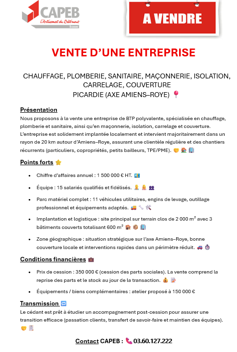 2025-12-03 11:00:00 VENTE D’UNE ENTREPRISE CHAUFFAGE, PLOMBERIE, SANITAIRE, MAÇONNERIE, ISOLATION, CARRELAGE, COUVERTURE PICARDIE AXE AMIENS–ROYE Téléchargez ici