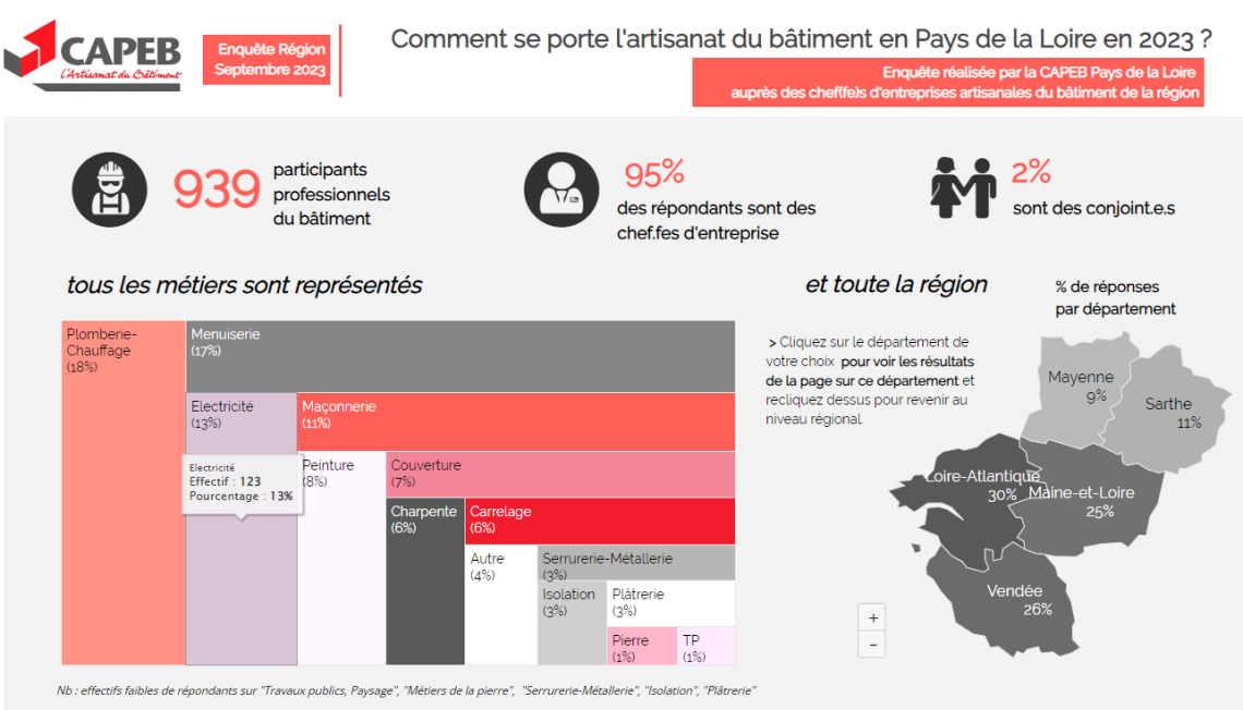 Enquête réalisée du 29 août 2023 au 19 septembre 2023, par VOUSECOUTE, pour le compte de la CAPEB Pays de la Loire auprès des adhérents de Loire-Atlantique, Maine et Loire, Mayenne, Sarthe et Vendée.