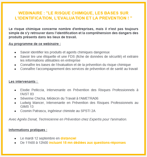 Webinaire - LE RISQUE CHIMIQUE, LES BASES SUR L'IDENTIFICATION, L'EVALUATION ET LA PREVENTION !