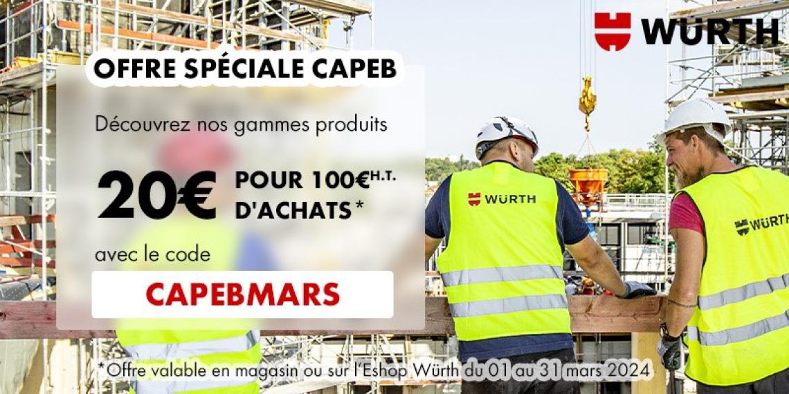 - Vous trouverez également un Coupon promotionnel de 20€ offerts dès 100€ d’achat pour les adhérents CAPEB (offre valable sur l’e-shop et en magasin).