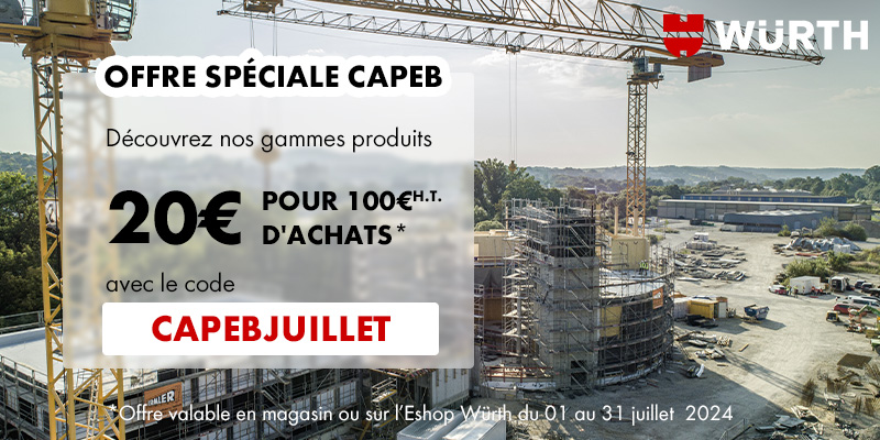 - Vous trouverez également un coupon promotionnel de 20 € offert dès 100€ d’achat pour les adhérents CAPEB (offre valable sur l’e-shop et en magasin)