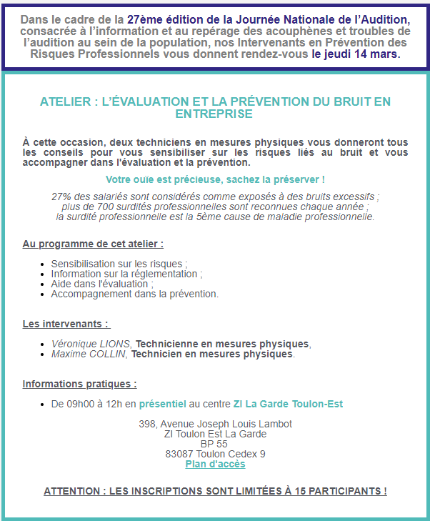 27ème édition de la Journée Nationale de l'Audition La prévention et l'évaluation du bruit en entreprise Je m'inscris à la session du jeudi 14 mars Cliquez ici pour découvrir nos prochains ateliers et webinaires de la prévention !