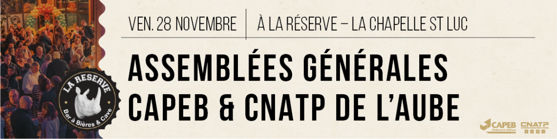 Nous vous invitons à participer à la 72ᵉ Assemblée Générale de la CAPEB et de la CNATP de l’Aube, le vendredi 28 novembre 2025 à La Réserve, à La Chapelle Saint-Luc.