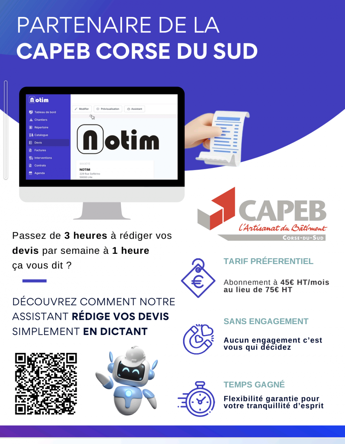 – Présentation du logiciel Notim avec IA intégrée, devis, factures, transformation automatique de votre DPGF en devis professionnel et structuré, prêt à convaincre vos clients, etc... (tarif négocié CAPEB 2A)