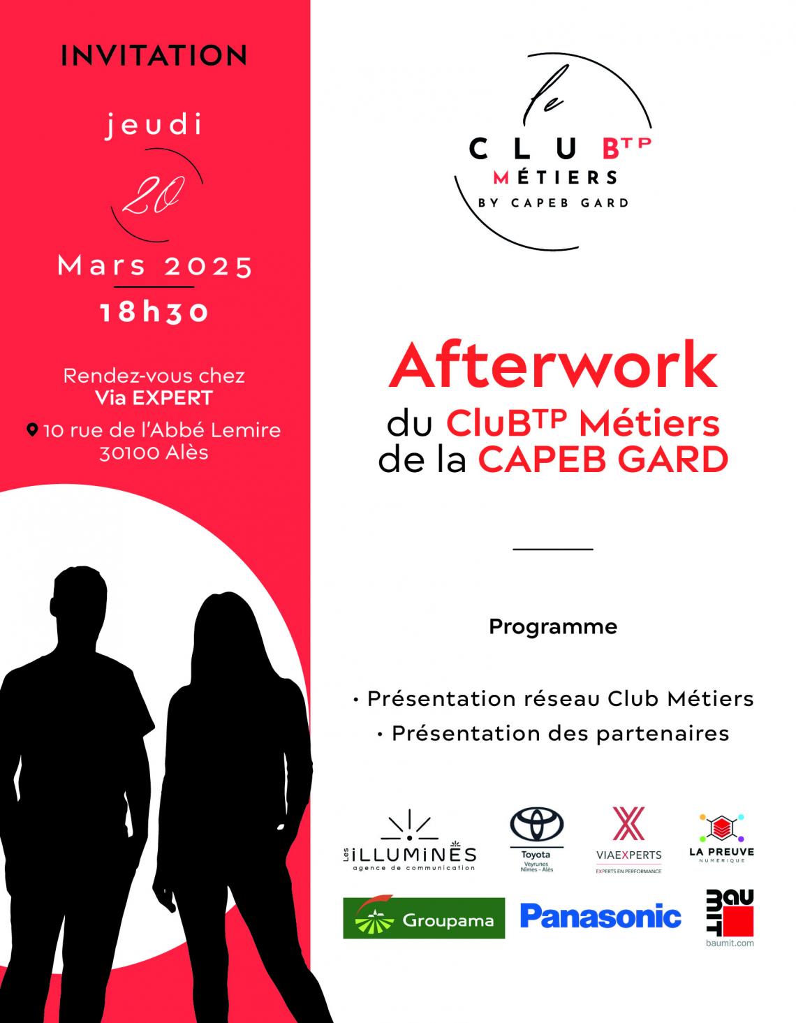 Notez sur votre agenda votre 1er Afterwork du Club Métiers BTP chez VIA EXPERT à Alès à partir de 18h30 et invitez vos collègues !