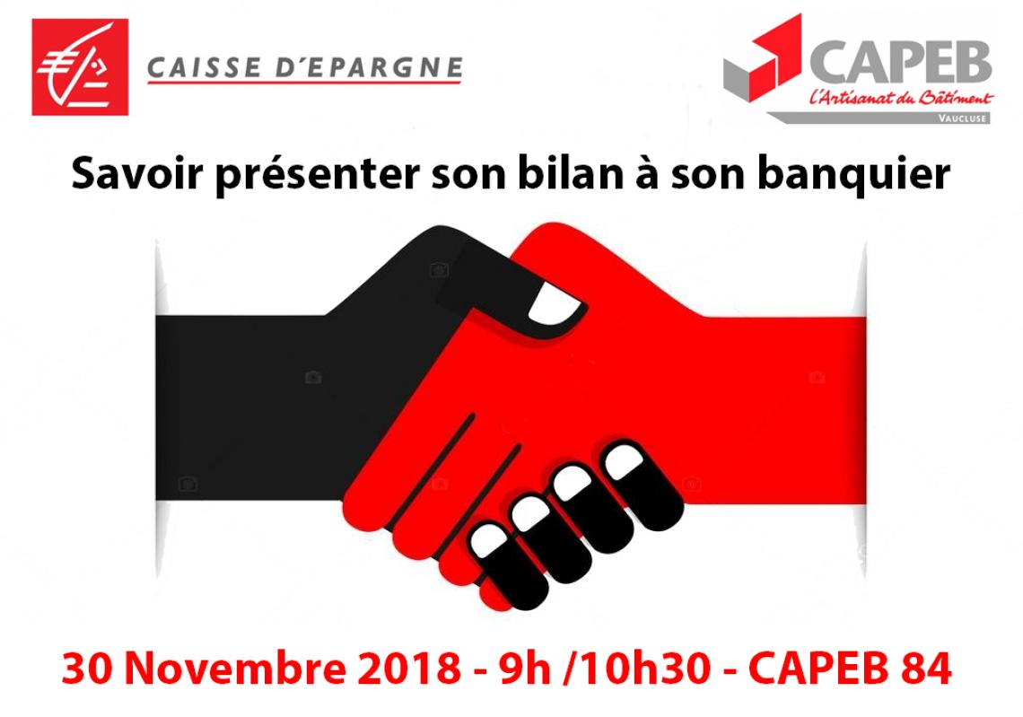 Vendredi 30 novembre de 9h à 10h30 (dans les locaux de laCAPEB 84) : Apprendre à présenter son bilan à son banquier. Que faut-il dire ? Que faut-il éviter ? Quelle est l'attente du banquier ? Comment enrichir /maintenir la relation de confiance ? Quelles sont les contraintes du banquier ?