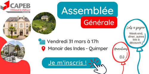 L'Assemblée Générale de la Capeb Finistère aura lieu le vendredi 31 mars à 17h au Manoir des Indes à Quimper.