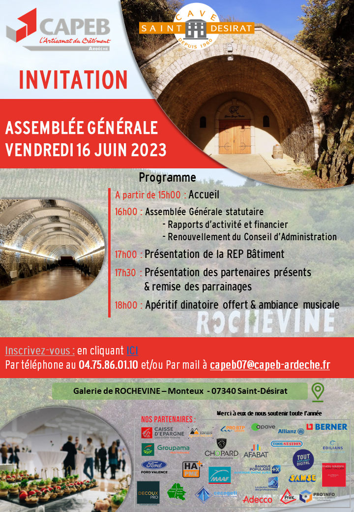 Cette année, la CAPEB Ardèche tiendra son Assemblée Générale le vendredi 16 juin 2023 à partir de 15 h à la Cave de Saint Désirat dans la magnifique galerie de ROCHEVINE au milieu des côteaux de St Joseph.