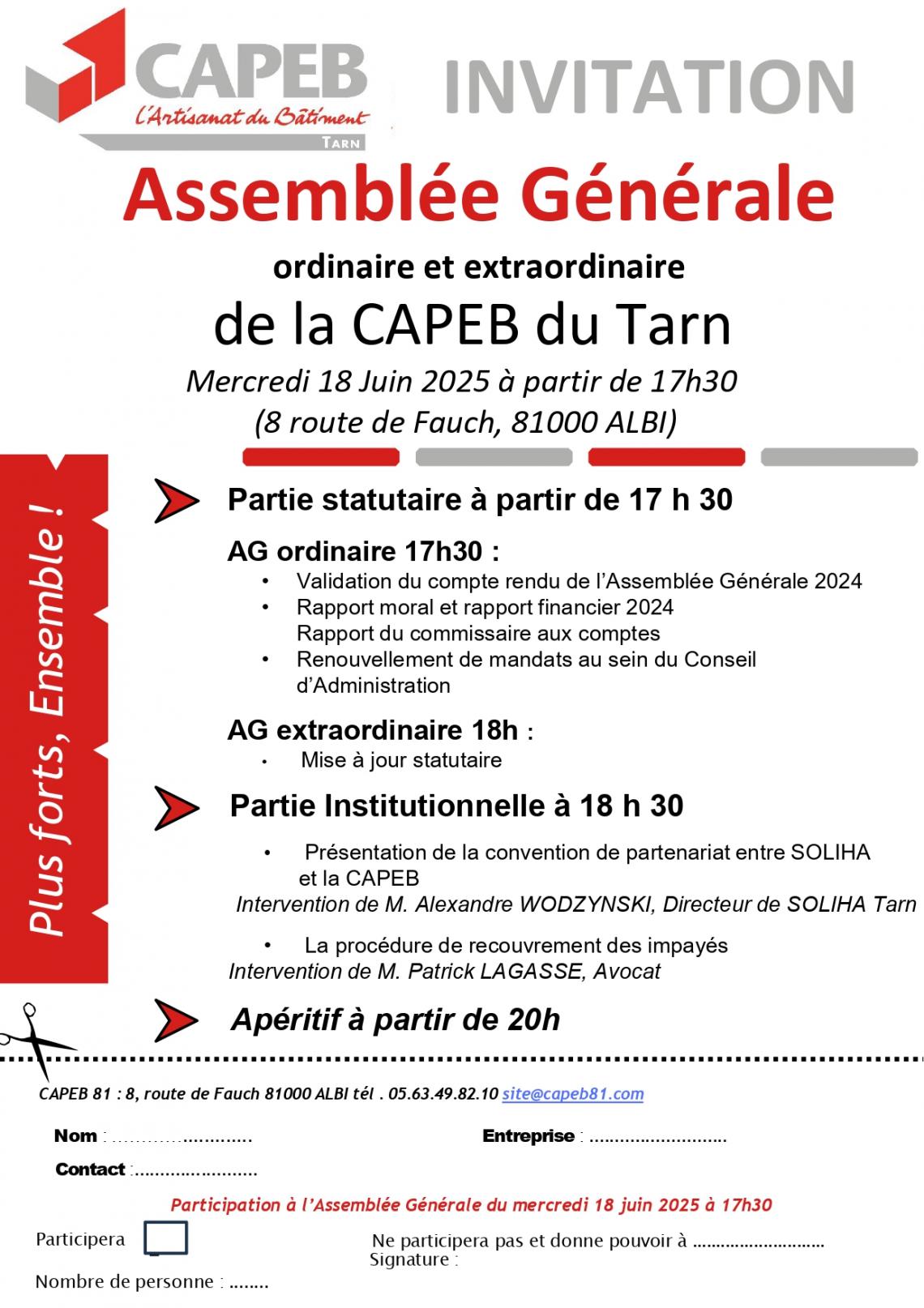 Assemblée Générale CAPEB Tarn La CAPEB du Tarn vous invite à son Assemblée Générale ordinaire et extraordinaire 2025 mercredi 18 juin
