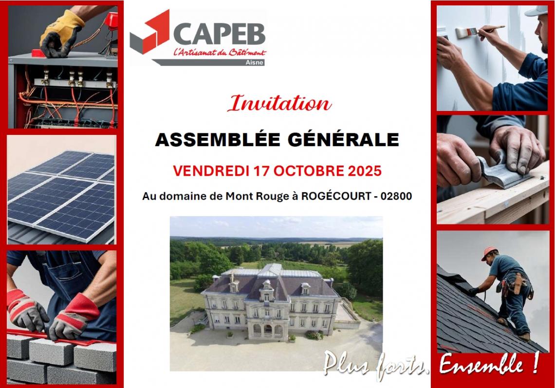 La CAPEB de l'Aisne organise le 17 OCTOBRE prochain son Assemblée Générale annuelle au Domaine du Mont Rouge à Rogécourt - 02800 Adhérents de la CAPEB Aisne : inscrivez-vous vite !
