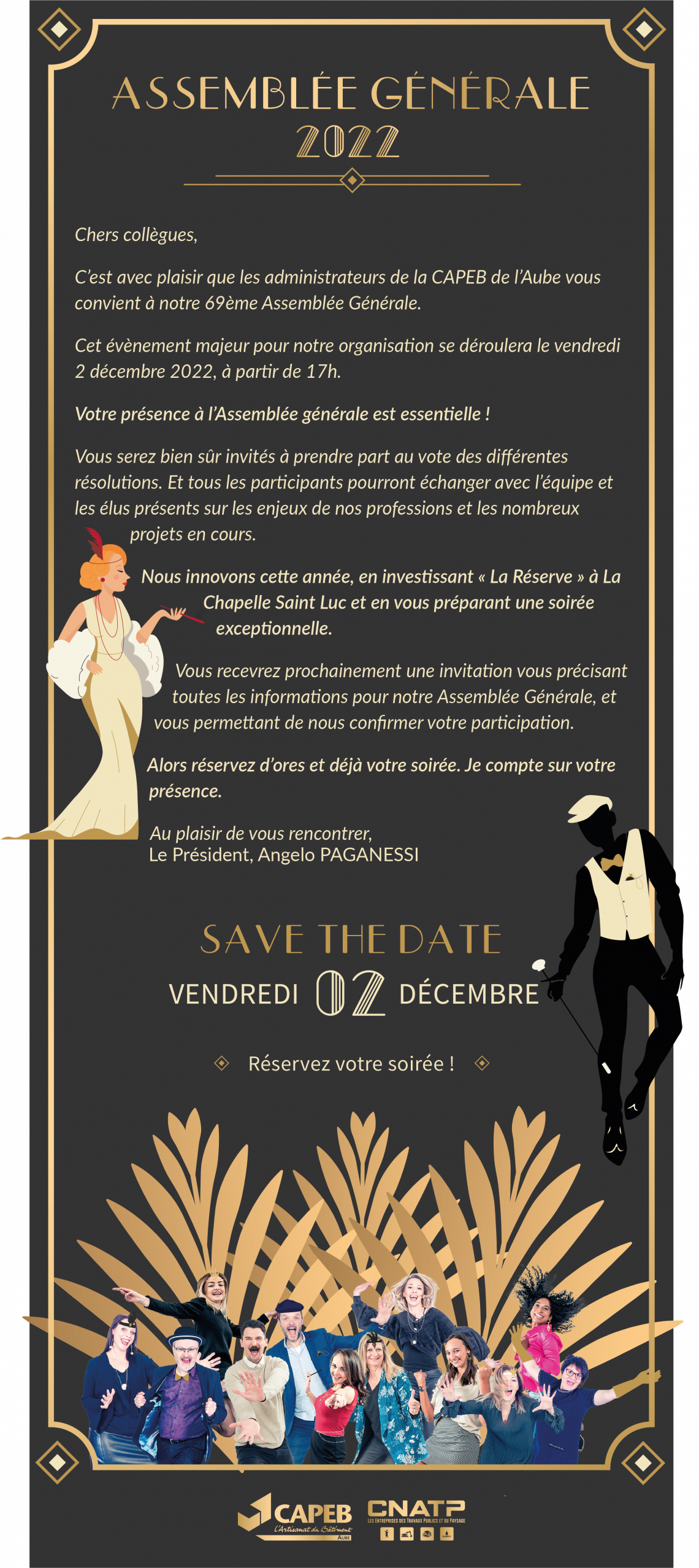 Assemblée Générale de la CAPEB - 2022 L'Assemblée générale de la CAPEB se tiendra le vendredi 2 décembre à la Réserve située à La Chapelle St Luc.