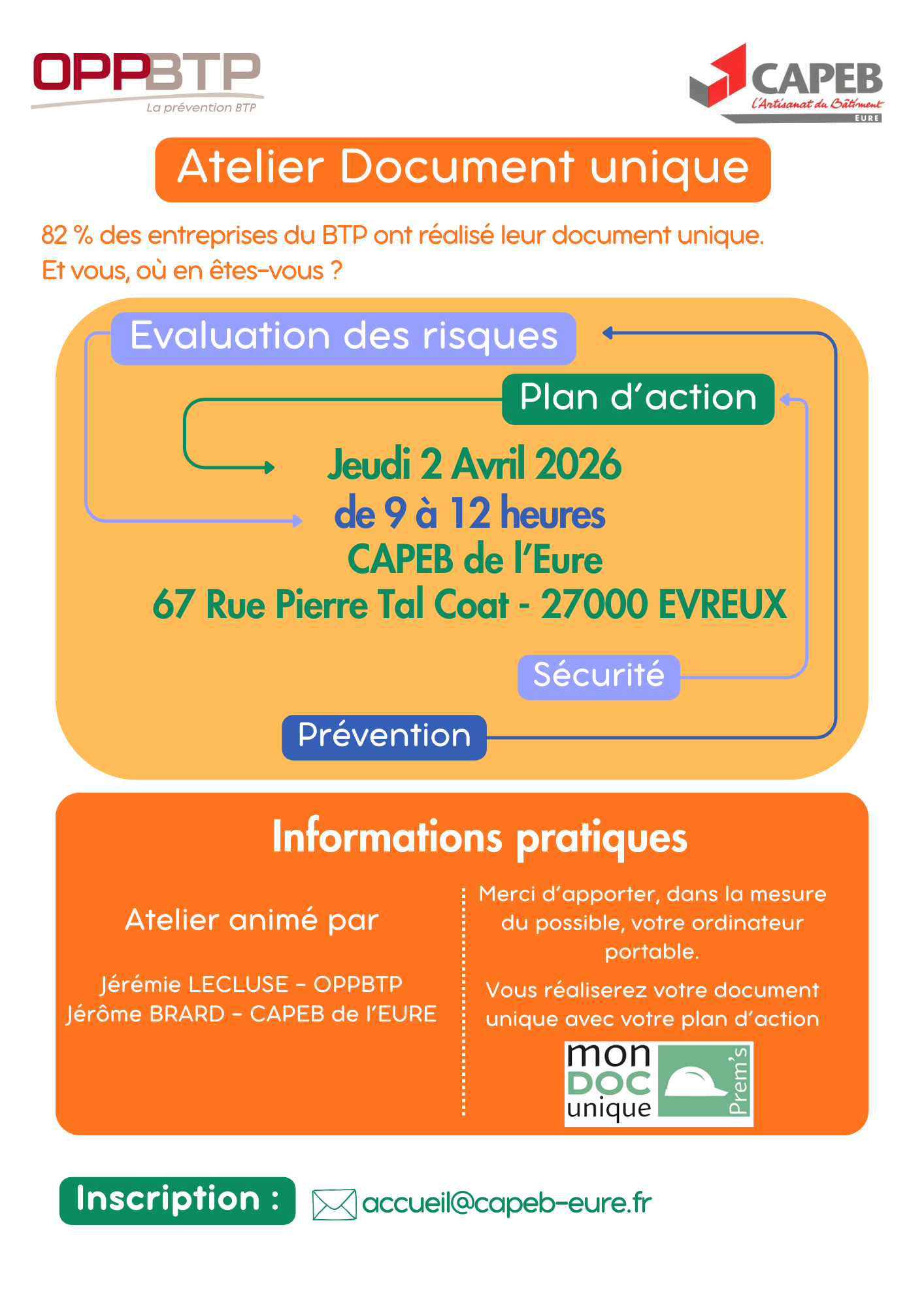 Atelier Document unique Venez rédiger votre document unique lors de notre atelier animé par l'OPPBTP. Invitation en cliquant ici