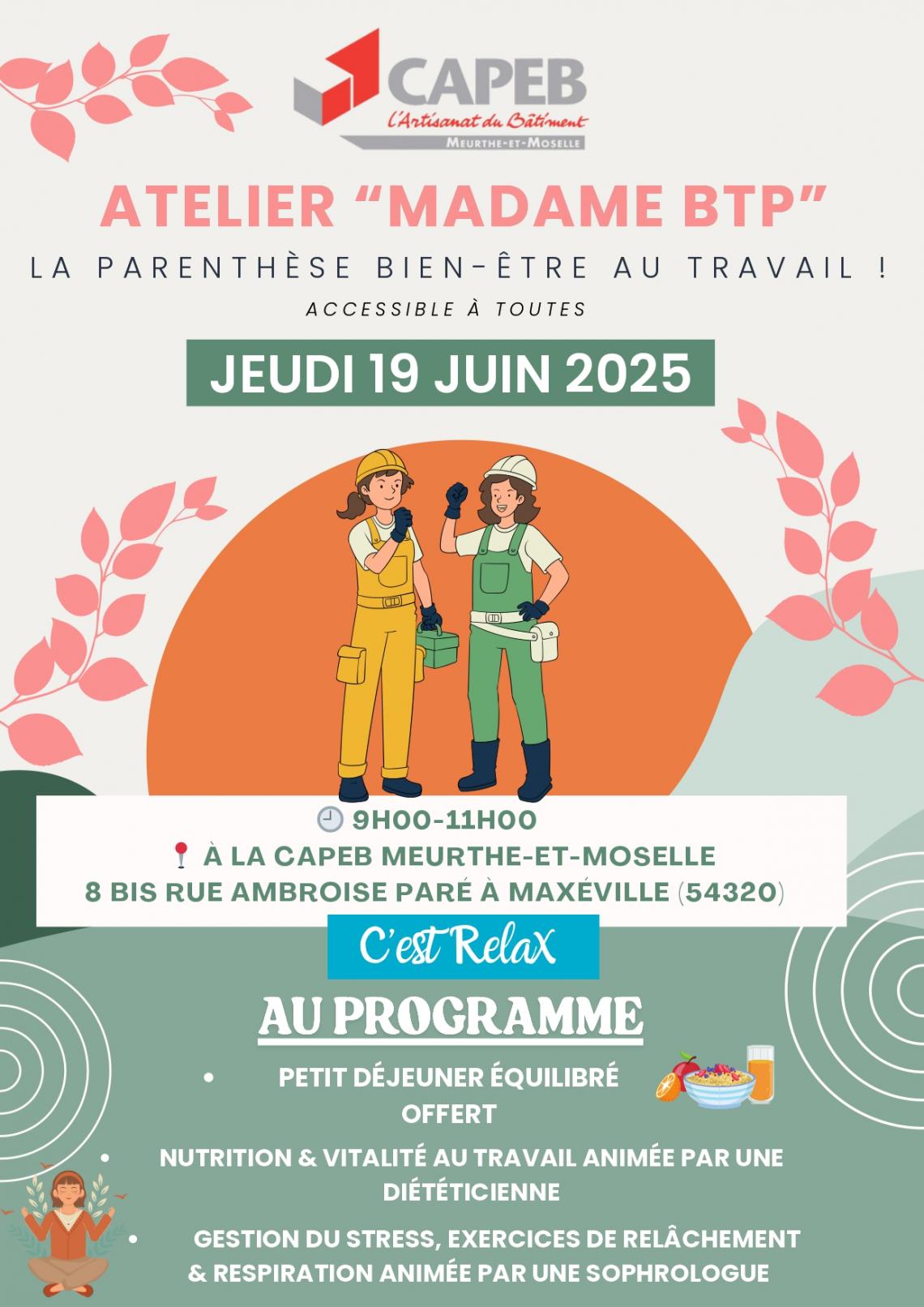 Atelier MADAME BTP : La parenthèse bien-être au travail, spécial adhérent Contactez nous pour plus d'informations : 03.83.95.61.10