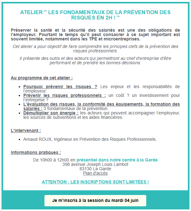ATELIER " LES FONDAMENTAUX DE LA PRÉVENTION DES RISQUES EN 2H ! " Je m'inscris à la session du mardi 04 juin