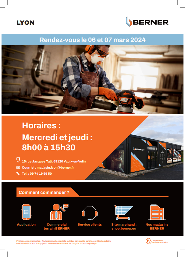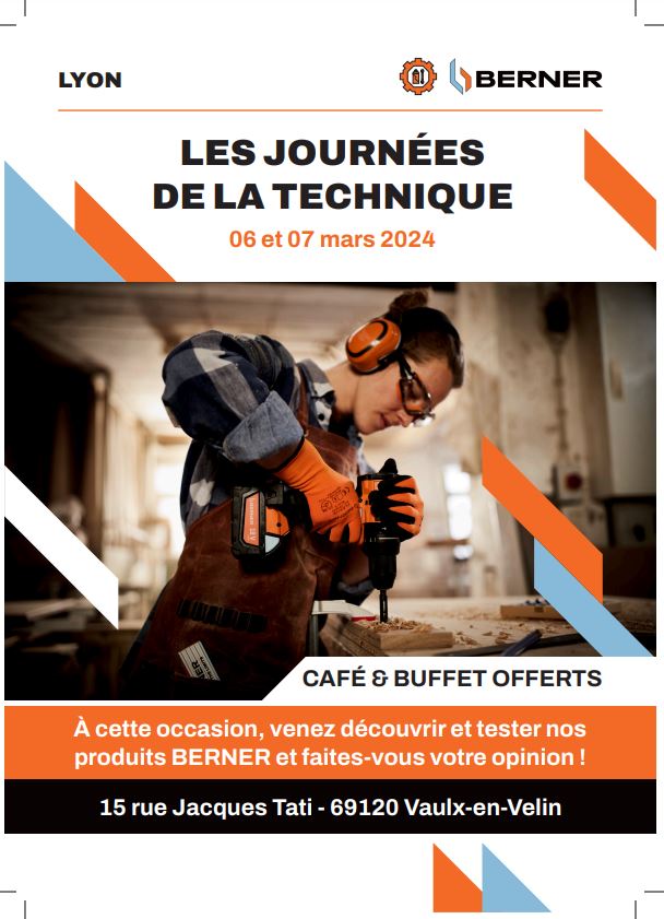 BERNER : Journées de la Technique Venez découvrir et tester nos produits BERNER lors des Journées de la Technique. Mercredi 06 et Jeudi 07 mars 2024, de 8h à 15h30 Shop BERNER, 15 rue Jacques Tati - 69120 Vaulx-en-Velin