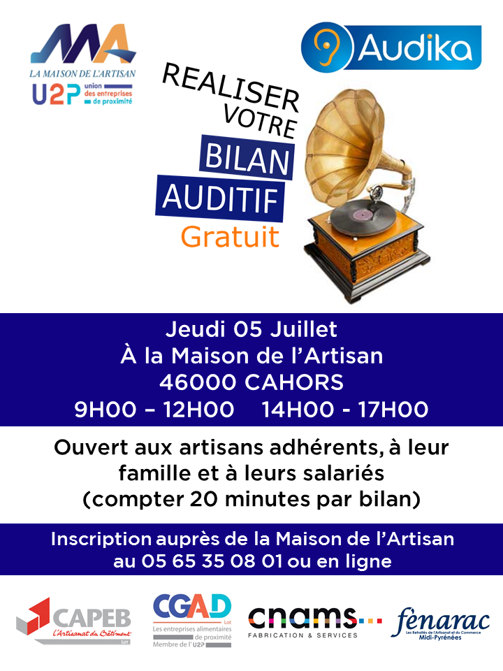 Bilan Auditif Gratuit Ouvert aux artisans adhérents, à leur famille et à leurs salariés (compter 20 minutes par bilan)