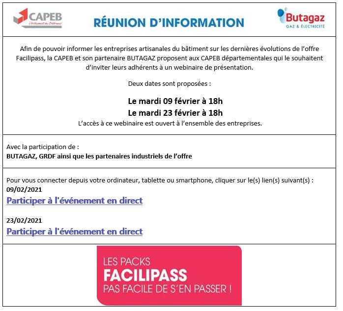 Afin de pouvoir informer les entreprises artisanales du bâtiment sur les dernières évolutions de l’offre Facilipass, la CAPEB et son partenaire BUTAGAZ proposent aux CAPEB qui le souhaitent d’inviter leurs adhérents à un webinaire de présentation avec le lien ci-dessous pour se connecter.