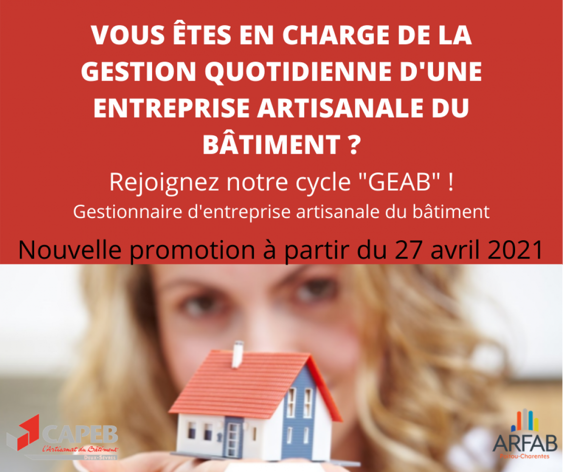 Aussi, n’attendez plus ! Rejoignez la prochaine session de la formation «G.E.A.B– Gestion de l’Entreprise Artisanale du Bâtiment » proposée par la CAPEB Deux-Sèvres en partenariat avec l’ARFAB Poitou-Charentes et qui va s’ouvrir le 27 avril prochain.