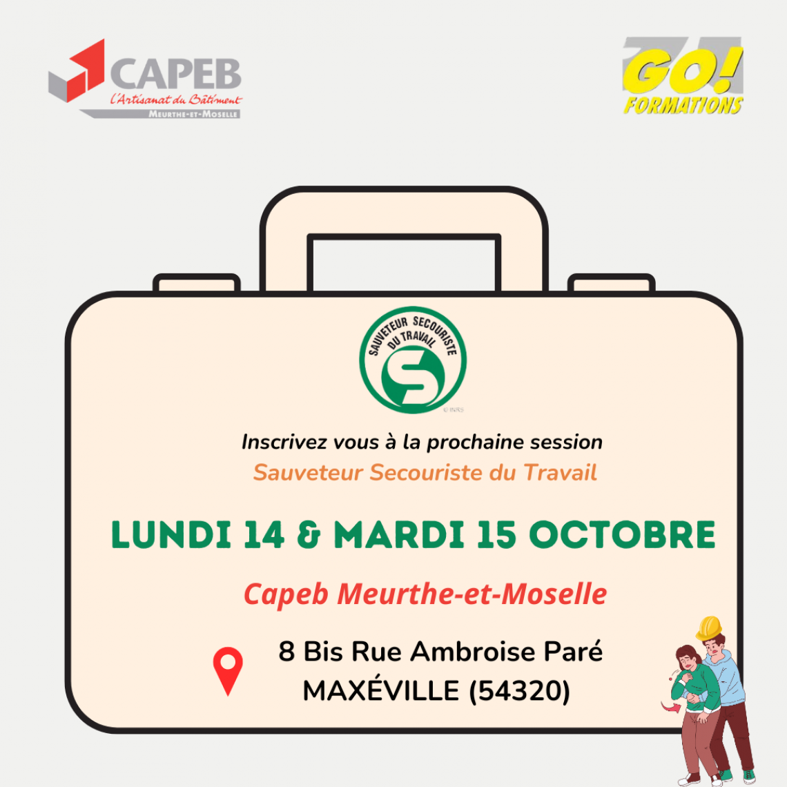 Soyez au rendez-vous les 14 et 15 Octobre pour notre prochaine formation Sauveteur Secouriste du Travail (SST) avec notre partenaire GO Formations !
