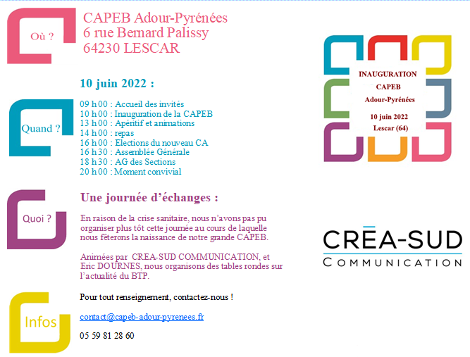 En raison de la crise sanitaire, nous n'avons pas pu organiser avant l'inauguration de notre CAPEB Adour-Pyrénées, mais nous avons décidé de nous rassembler le 10 juin 2022 pour fêter l'événement, et échanger en convivialité.
