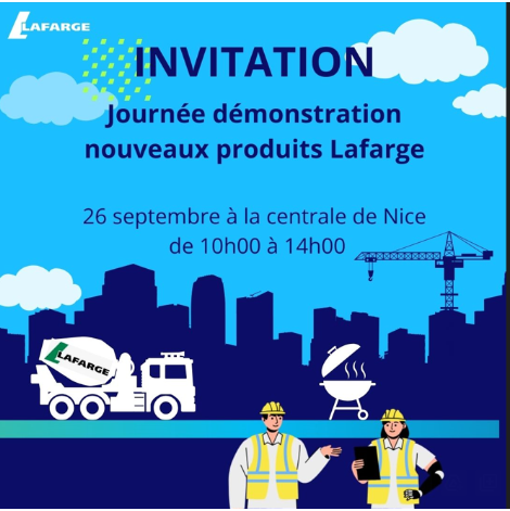 Nous avons le plaisir de vous inviter le 26 septembre, à la centrale de Nice, pour assister à une démonstration de nos nouveaux produits et innovations, comme le béton drainant et dépolluant Hydromedia New Air, une petite révolution dans le domaine des revêtements de sols (meilleur pour l'environnement!)