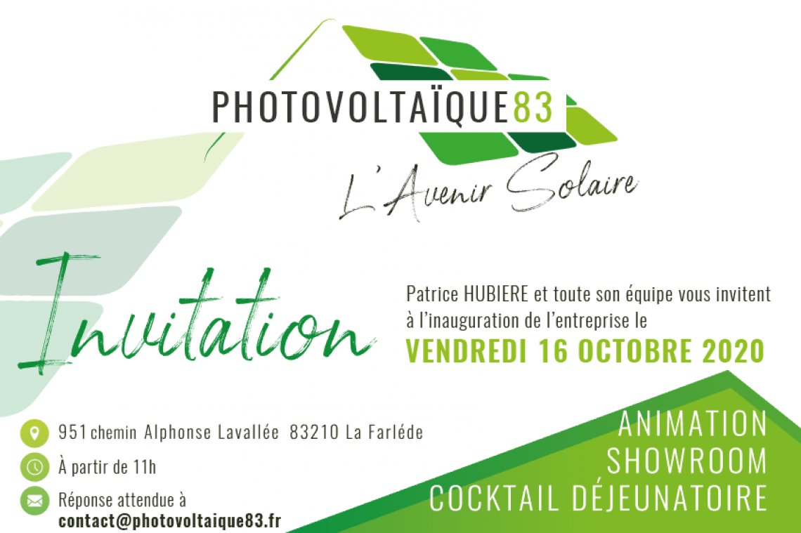 Invitation inauguration Photovoltaïque 83 Notre adhérent, Patrice HUBIERE et toute son équipe vous invitent à l'inauguration de l'entreprise. Réponse attendue par mail à contact@photovoltaïque83.fr Animation Showroom Cocktail déjeunatoire