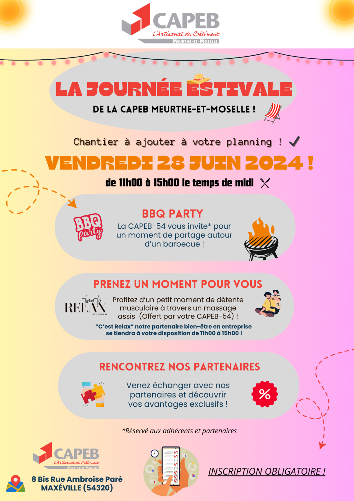 La CAPEB Meurthe-et-Moselle a le plaisir de vous inviter à sa Journée Estivale le 28 Juin prochain de 11h00 à 15h00 le temps de midi !