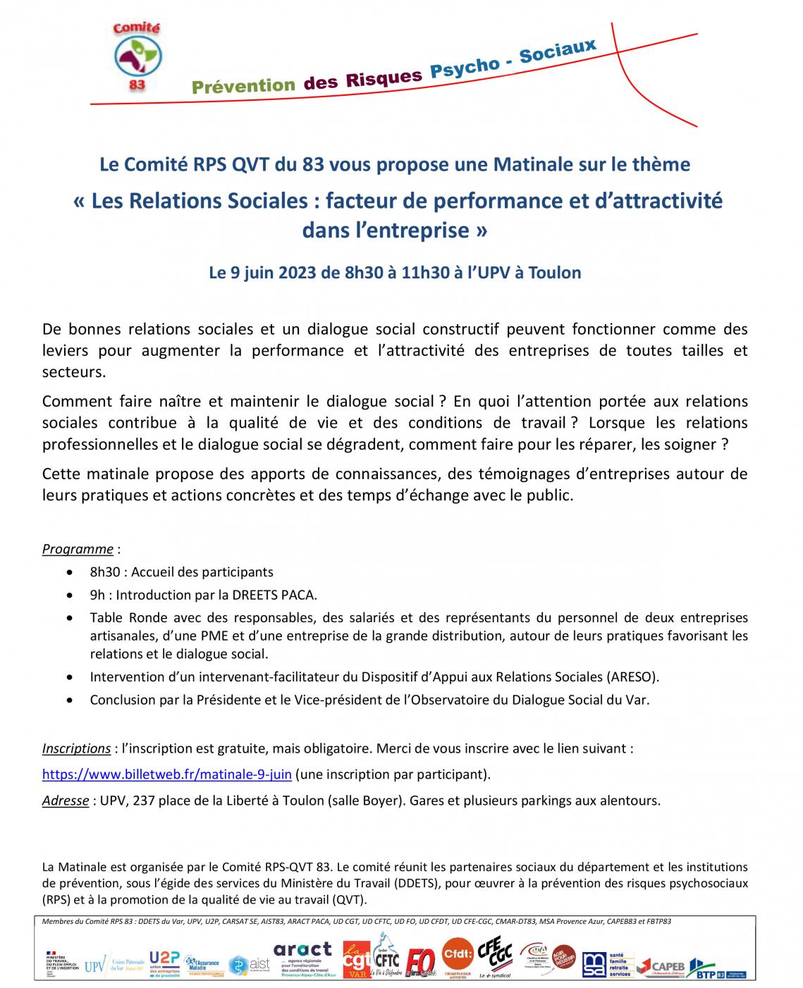 Le Comité RPS QVT du 83 vous propose une Matinale sur le thème « Les Relations Sociales : facteur de performance et d’attractivité dans l’entreprise »