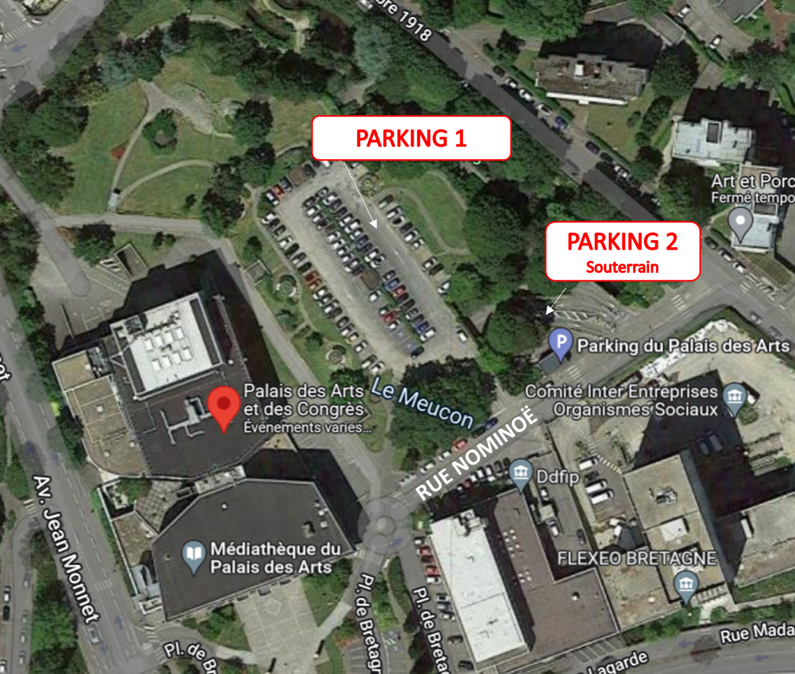 - PARKING : un parking vous est réservé. Il s’agit du parking n°1 (cf. plan ci-dessous) accessible via la rue nominoë. Ce parking nécessite un code pour y accéder. Pour les personnes inscrites vous avez reçu ce code par mail et par texto. Si ce parking est complet (une centaine de places) il y a le parking n°2 ainsi que les stationnements autour du palais des arts.