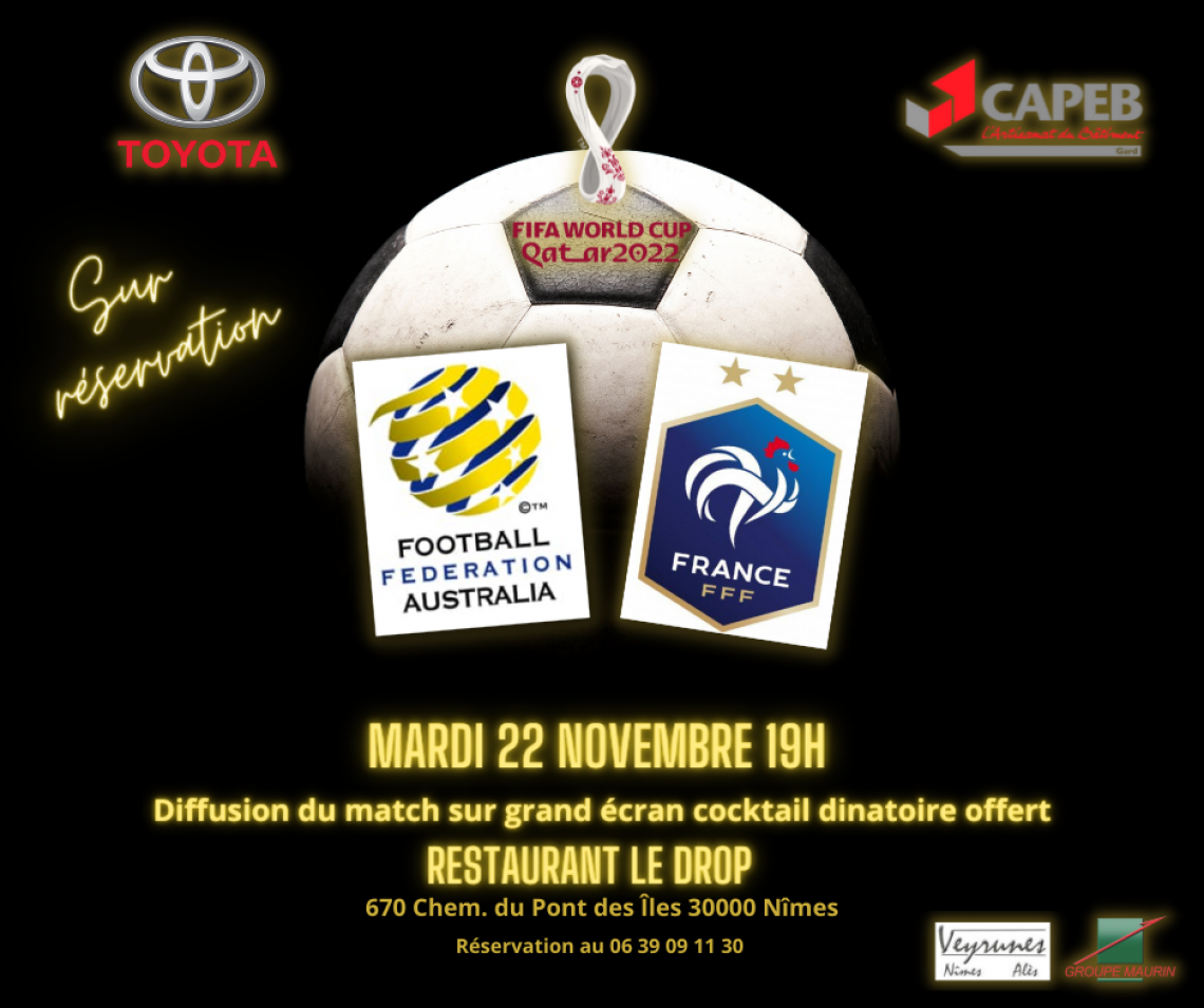 Pour se mettre dans l’ambiance le Garage Veyrunes Toyota et la CAPEB Gard vous proposent une soirée conviviale devant le match France - Australie, sur grand écran, accompagné d’un cocktail dinatoire.