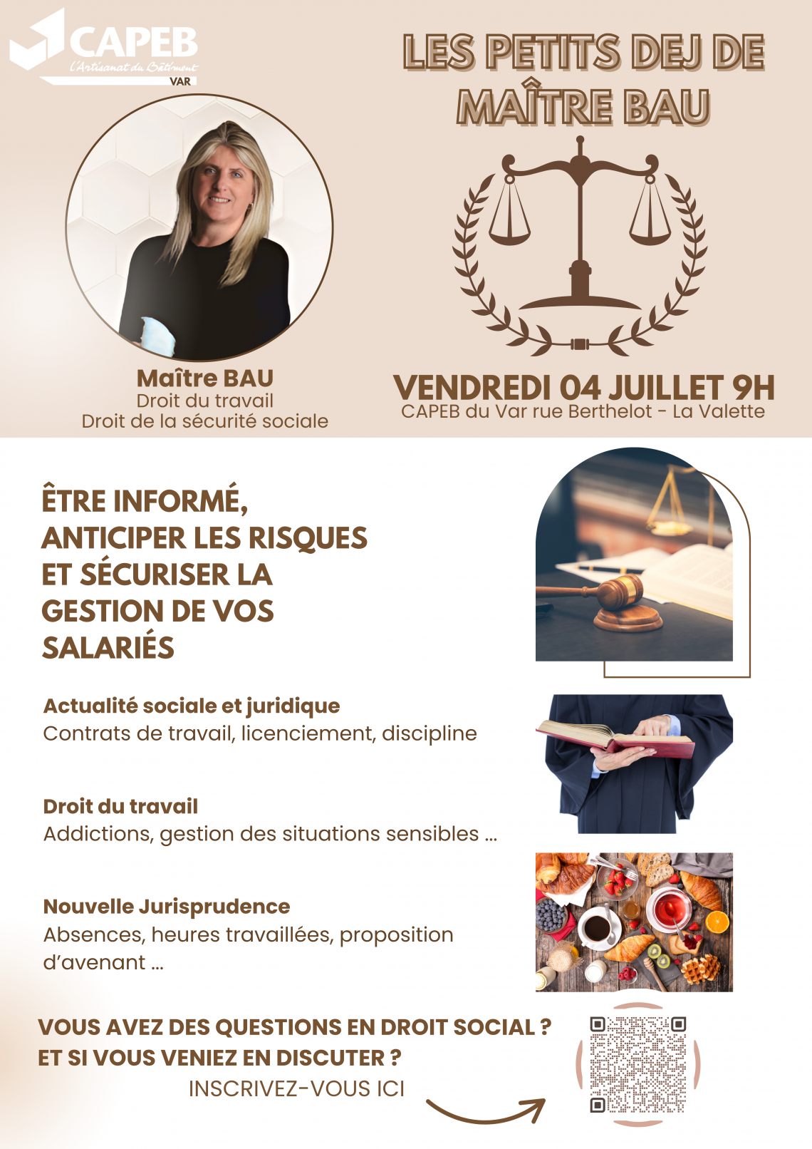 Les petits dej de Maître BAU Être informé, anticiper les risques et sécuriser la gestion de vos salariés Inscription obligatoire cliquez-ici