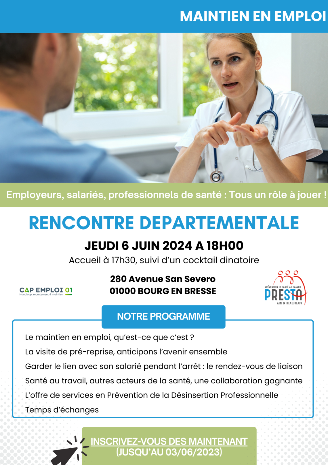 PRESTA AIN ET BEAUJOLAIS et le CAP EMPLOI 01 invitent les entreprises et les professionnels de santé de l'Ain et du Beaujolais à participer à la rencontre départementale sur le maintien en emploi organisée