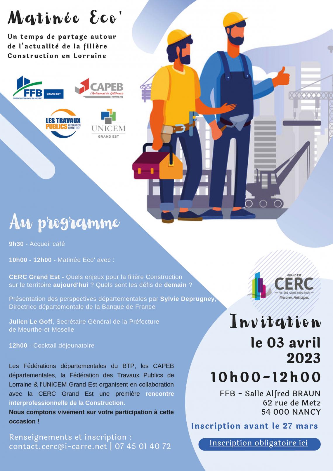 10h00 12h00 : Matinée Eco' avec :CERC Grand Est - Quels enjeux pour la filière Construction sur le territoire aujourd'hui ? Quels sont les défis de demain ?