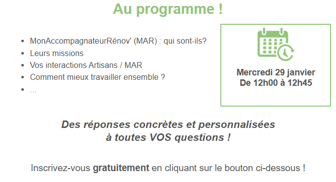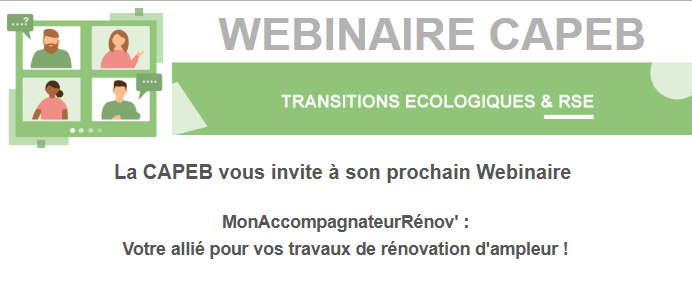 MonAccompagnateurRénov' : Votre allié pour vos travaux de rénovation énergétique Webinaire organisé par la CAPEB Auvergne-Rhône-Alpes Je m'inscris Cliquer ici pour vous inscrire !