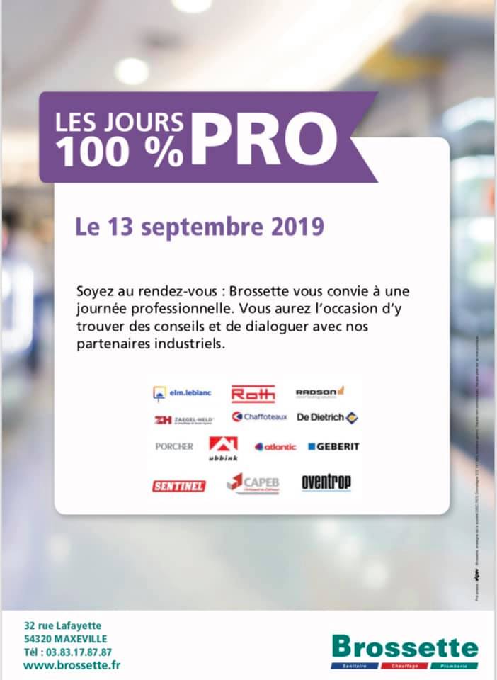 Nos Rendez-Vous de la rentrée Les jours 100% PRO dédiés aux Plombiers-Chauffagistes BROSSETTE vous invite le 13 septembre 2019 - 32 rue Lafayette 54320 MAXEVILLE