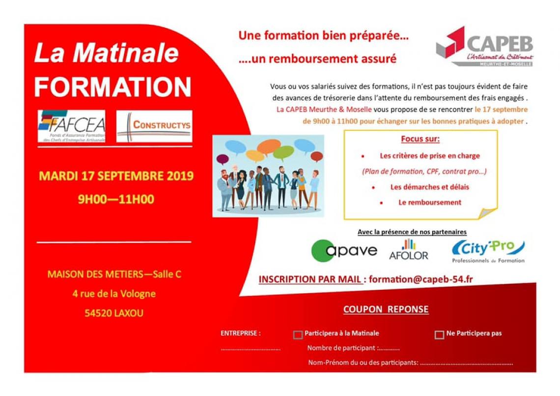 Nos Rendez-Vous de la rentrée Notez dès aujourd'hui notre 1er rendez-vous de la rentrée à la CAPEB 54 « la Matinale Formation » un rappel sur les bonnes pratiques à adopter
