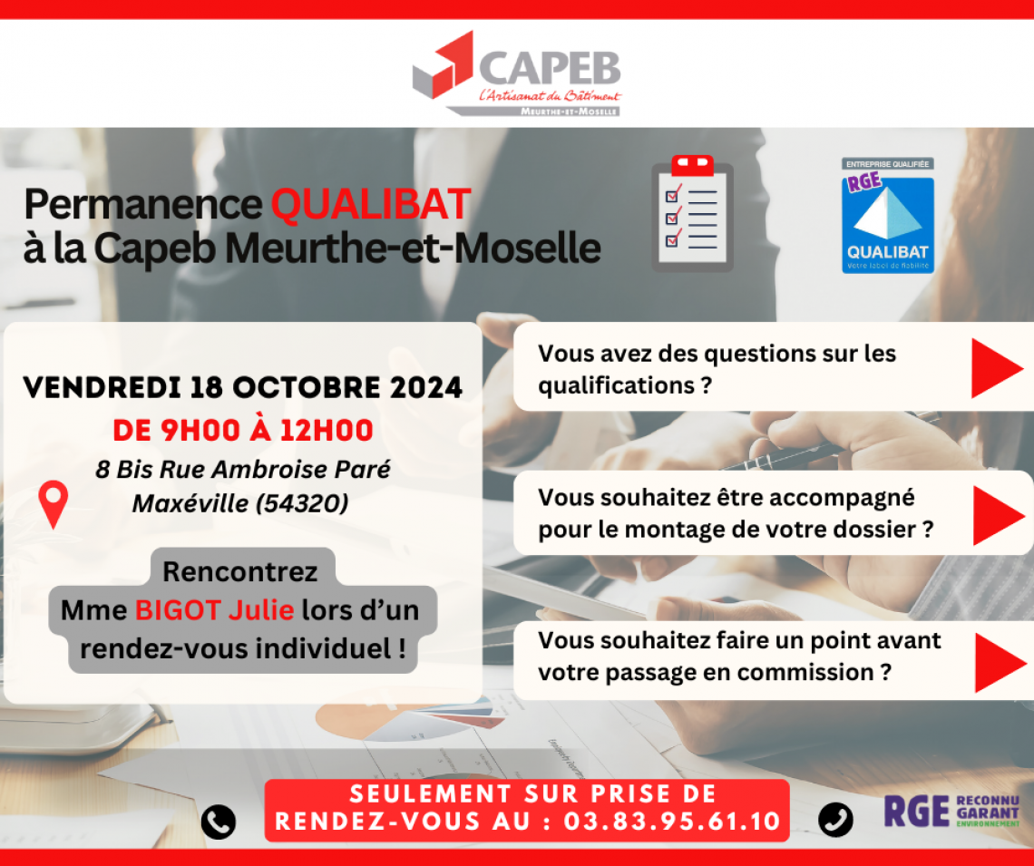 Prenez rendez-vous à la CAPEB Meurthe-et-Moselle et bloquez un créneau horaire le vendredi 18 octobre au matin dans votre Qualibat !
