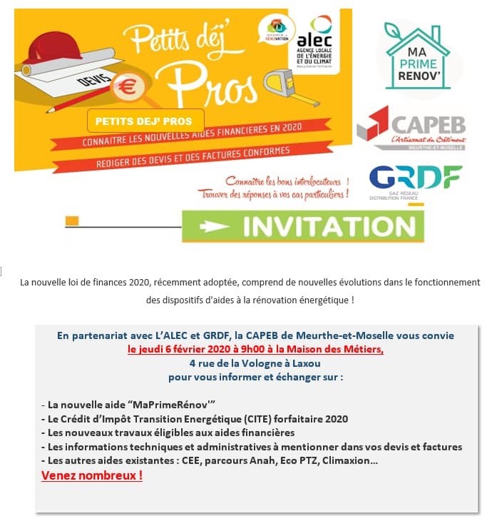 La nouvelle loi de finances 2020, récemment adoptée, comprend de nouvelles évolutions dans le fonctionnement des dispositifs d’aides à la rénovation énergétique, la CAPEB 54 en partenariat avec l’ALEC Nancy Grands Territoires et GRDF vous convie le 6 février prochain