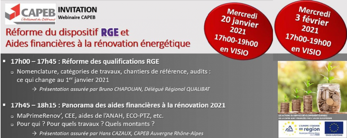 Le CAPEB Loire vous invite à deux webinaires de présentation de la réforme RGE et des aides financières à la rénovation 2021