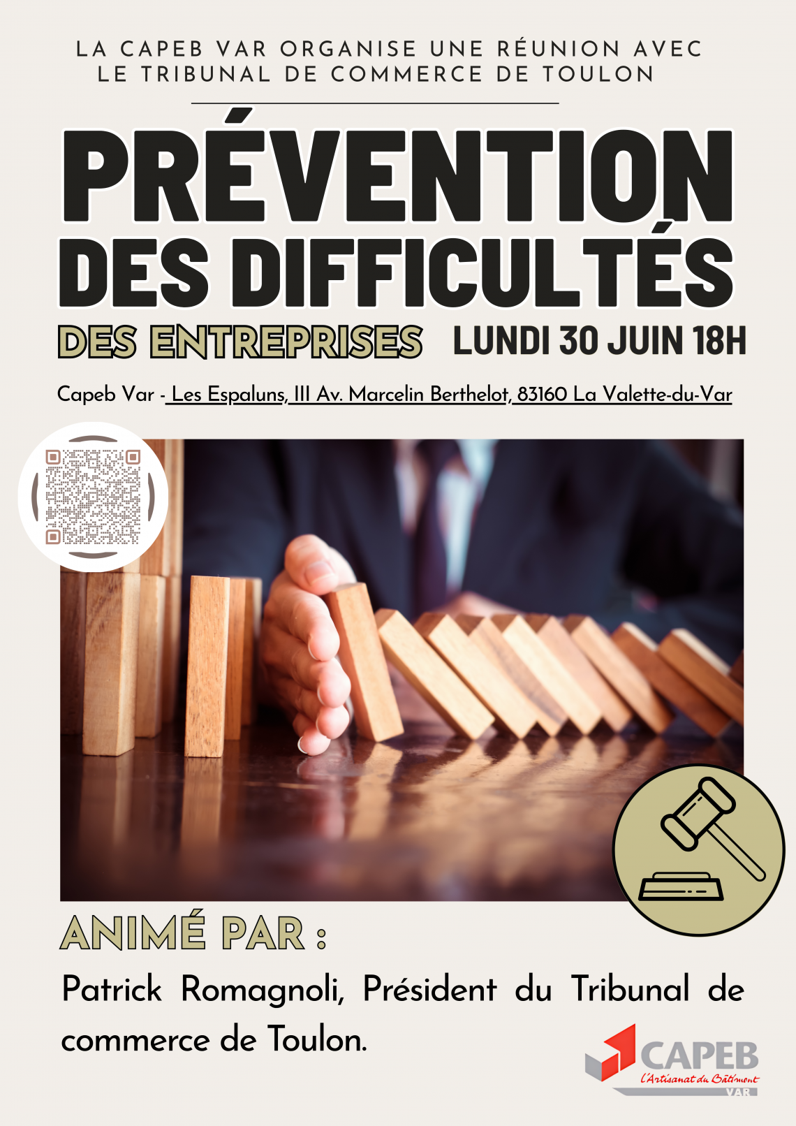 Prévention des difficultés La CAPEB VAR organise une réunion avec le Tribunal de commerce de Toulon Inscription obligatoire cliquez-ici