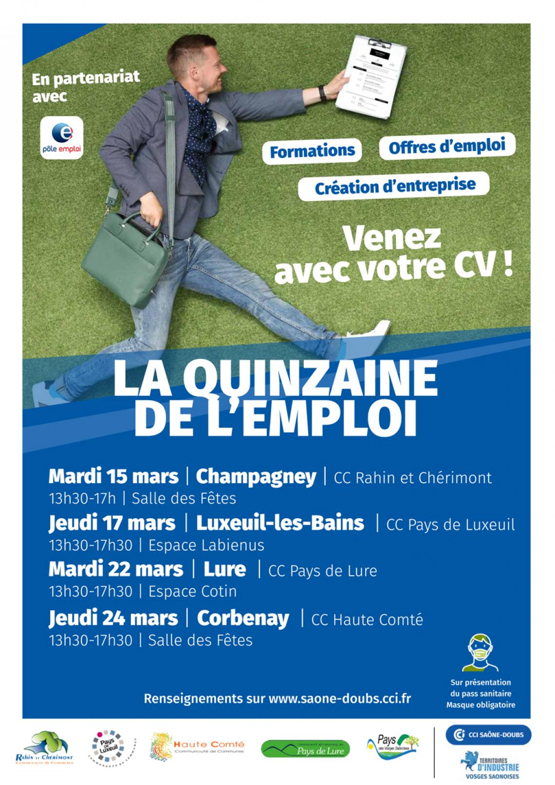 La CCI Saône-Doubs organise la Quinzaine de l'Emploi, en partenariat avec les communautés de Rahin et Chérimont, du Pays de Luxeuil, de la Haute Comté, du Pays de Lure, du Pays des Vosges Saônoises et le Pôle Emploi.