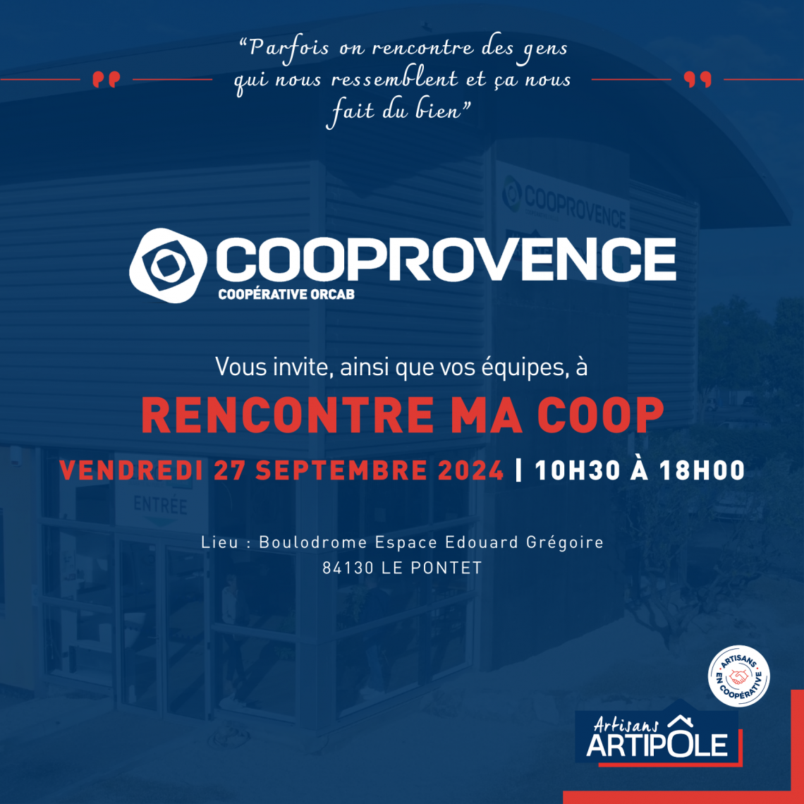 Rencontre ma Coop Retrouvez la stand de la CAPEB Vaucluse à la journée COOPROVENCE du 27 septembre 2024 de 10h30 à 18h au Boulodrome du Pontet