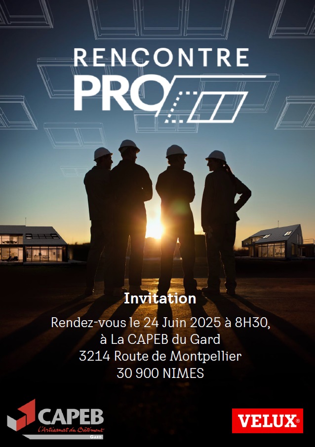 La CAPEB Gard vous convie à une rencontre professionnelle avec VELUX, conçue pour accompagner les artisans dans une meilleure maîtrise des produits et une gestion optimisée de leurs chantiers le 24 juin de 8h30 à 12h.