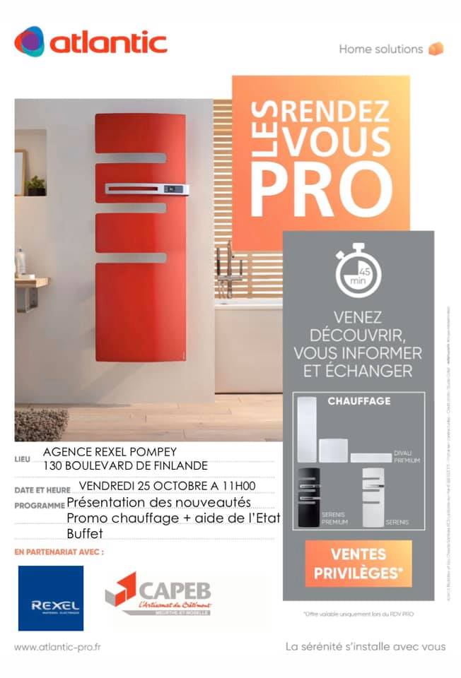 Prochain « Rendez-vous PRO » le 25 octobre prochain à partir de 11h00 chez REXEL, agence de Pompey, au programme : Aides de l’Etat, nouveautés et promo chauffage de notre partenaire ATLANTIC qui sera clôturé par un buffet.